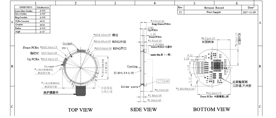 1 1 ) ?圓形模組的固定是通過三個 m R=0.7mm ?的 半圓孔來固定, , 定位柱半徑應(yīng)<0.7mm ,B PCB ?上以半圓孔為同心圓,m R=1.2mm ?為半徑的區(qū)域內(nèi)為元器件避空區(qū)域,請利用此區(qū)域定位 ;